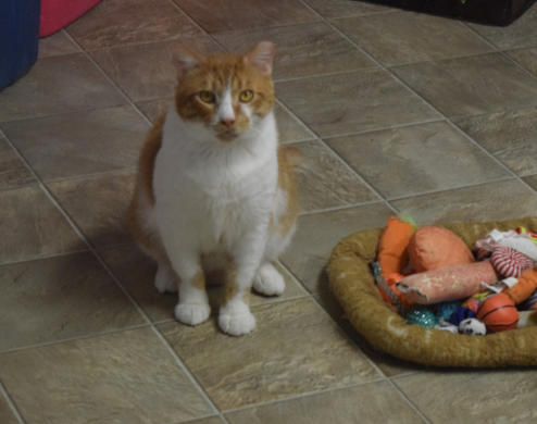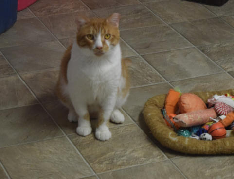 4/2019 Dennis is a leukemia positive kitty who came to us from Memphis.His former owner’s home was being foreclosed on and she was desperatefor a place for him to go.He is a big friendly kitty who loves to be loved on. We are enjoyinggetting to know him.You may watch him Live on his Pet Cam HERE House 2 Room 14/2023 He is a big friendly fellow who is doing well. He has developeddiabetes and has some arthritis and back pain and is getting laser treatmentsto help give him pain relief.