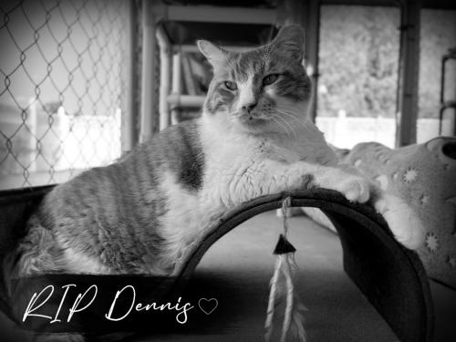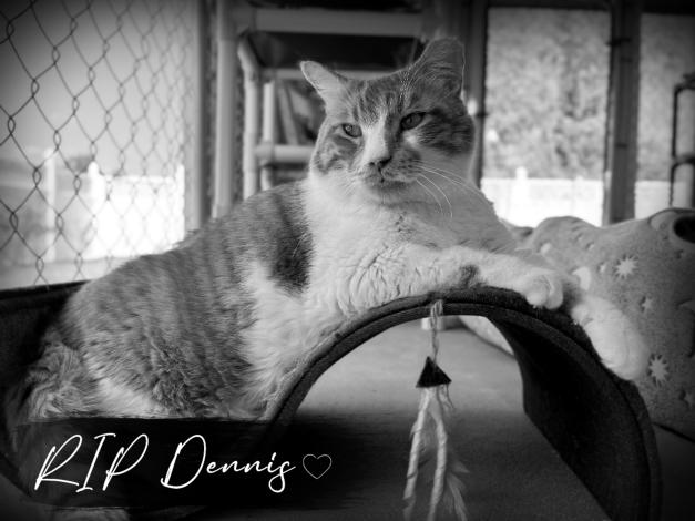 9/14/2023 This is a hard letter to write for everyone. Our cuddly giant, Dennis, passed over the rainbow bridge this morning. Dennis has had three vet visits over the past month due to his weight loss. On Tuesday, he was not eating and was taken to the vet to be hospitalized and given a feeding tube. We are stumped. His bloodwork was normal. His surgery went well and was supposed to come home tomorrow. The night tech monitored him all night. He was alert and seemed very comfortable. During shift change this morning and during hospital rounds he passed away. It's unclear at this time what caused his passing but our greatest foe cancer is suspected. We are getting a necropsy done so we hopefully have a chance to know what happened.. We will miss his long stretches across the floor offering his belly while purring in complete bliss. His persistence to escape for the lobby so he can take the visitors and staff on a stroll through the memorial garden. We will miss the nibbles of excitement he would bestow when he was enjoying the cuddles, but it was the ultimate sign of gratitude for snacks and catnip. As his favorite scratcher is left empty we are left reminiscing over his stoic pose where he enjoyed life around him. We are comforted to know that he was given four and half years with us because of your wonderful and generous support. We are heart broken.