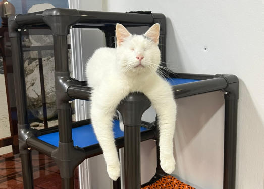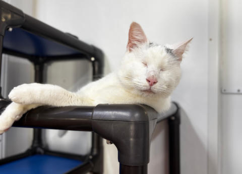 BlindGender: MaleApproximate age:Arrived From: Scotland County, NCArrival Day: 2011Mickey came to us as a tiny kitten from the high-kill Scotland County Humane Society where he had been dumped at night in their outside drop-off box. Poor Mickey was very sick with a severe upper respiratory infection. They realized no one was going to come looking for this little fellow so immediately released him to us. When we picked him up, he was so sick he had stopped eating. He went right to our vet and right away began antibiotic treatment for the respiratory infection and his ear infections. At BCR he got a flea bath because he was infested with them. It took two days for Mickey to feel better and start eating on his own. If Mickey’s original owner had just gotten him treatment for his upper respiratory infection, he would have his eyes. However, being blind has not stopped Mickey in any way from enjoying his life. He’s one of the most loving cats at BCR and has a wonderful personality. He loves to sit in laps and knead! You can watch Mickey on our live 24-hour cameras is in House 2, Room 3. HERE