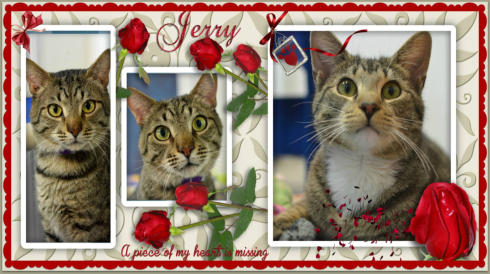 2/14/2017 We had know since late last year that Jerry would only be with usfor a few months. Ultra sounds showed that his check and abdomen werefull of tumors. Today Sweet Jerry developed problems breathing due to allthe tumors he had and bleeding behind one of his eyes. The time to let himgo was here. He was purring to the end. Such a sweet boy who gota really bad deal in life. He will be missed.